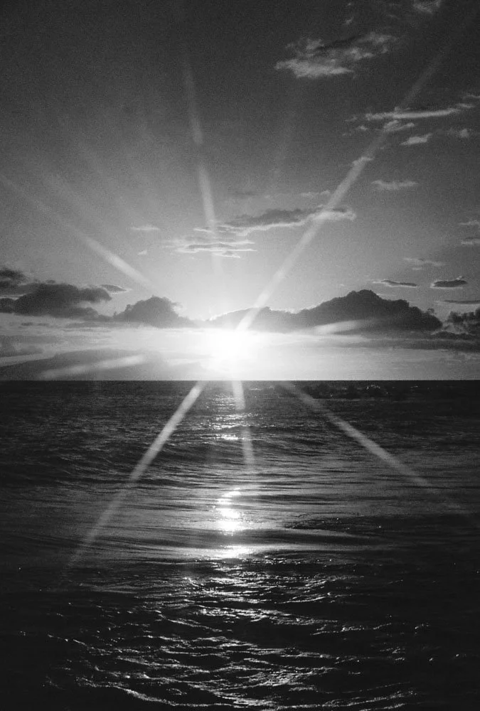A black and white beach scene at sunset. The sun is refracted back in the shape of a 6 point star.