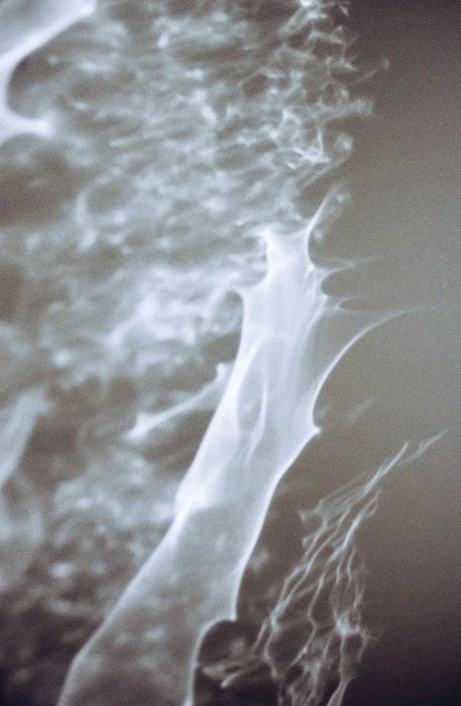 A white monochromatic image of a woman holding an orb above her head. She is seen through a prism, refracting her body and multiplying it.
