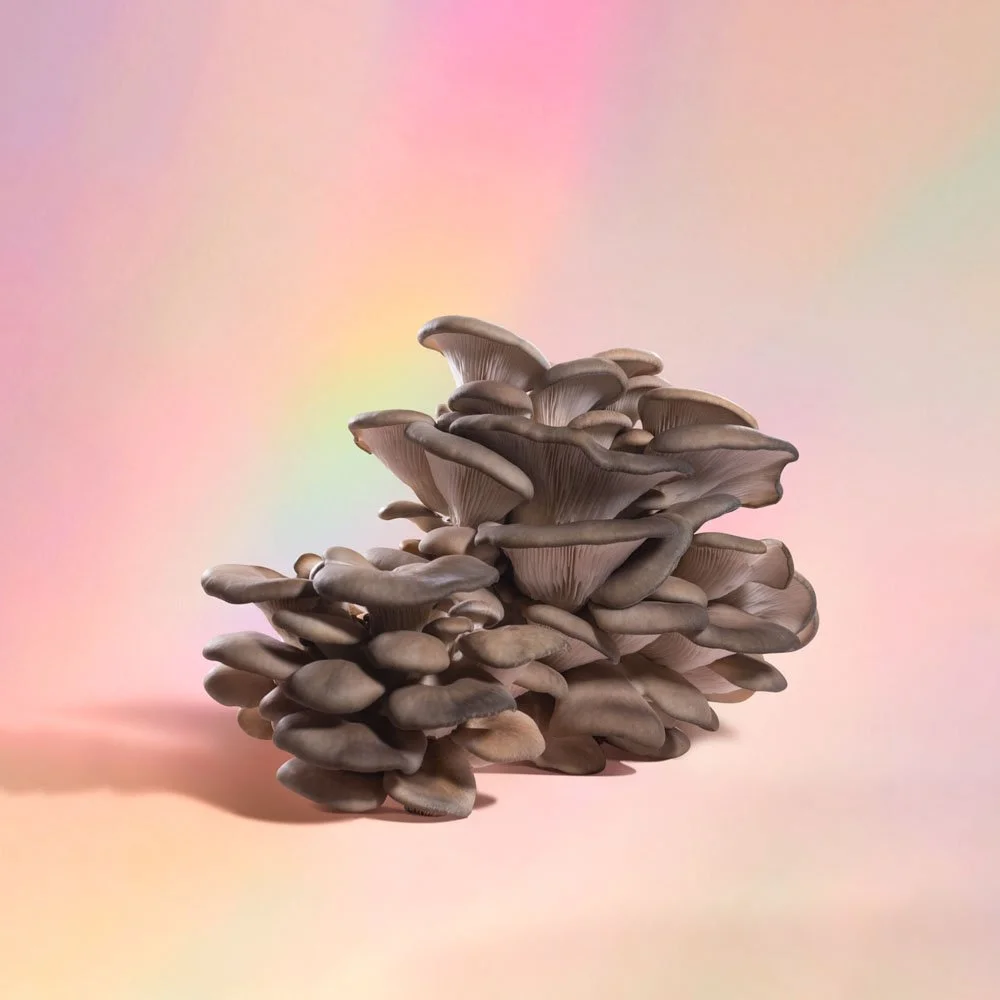 Pink oyster mushroom on a rainbow background. A rainbow circular pattern radiates from the center outwards.